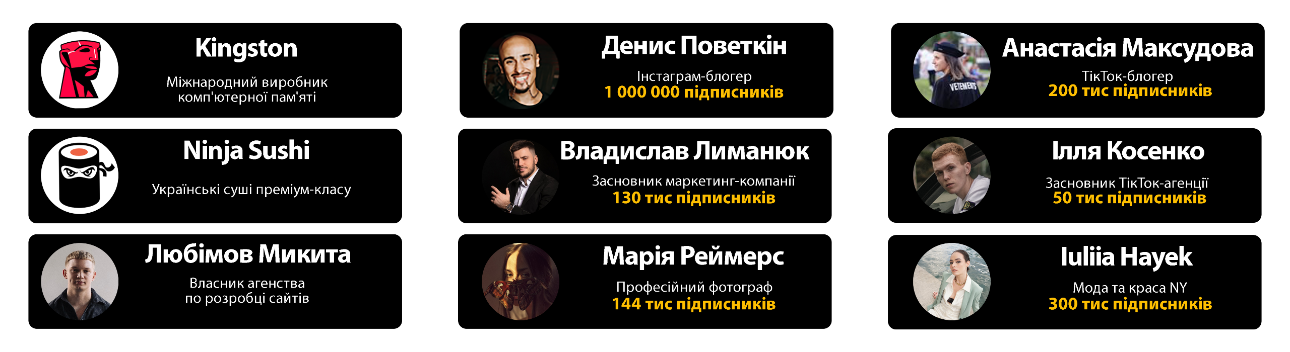- TikTok/Instagram блогерів;